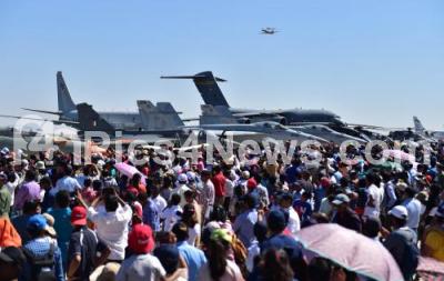 Photo Caption : Visitors watching aircrafts display during 12th edition of Aero India 2019 at Yelahanka air base, in Bengaluru on Saturday 23rd February 2019