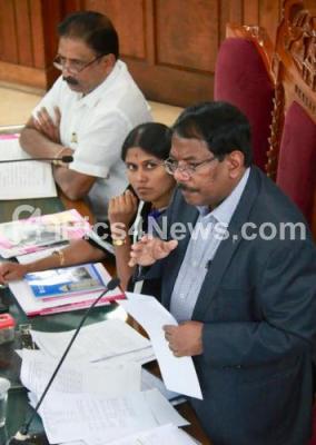 Photo Caption : Mayor Gangambike Mallikarjuna with Deputy Mayor Bhadregowda, BBMP Commissioner Manjunath Prasad during BBMP council Budget session at BBMP, in Bengaluru on Saturday 23rd February 2019