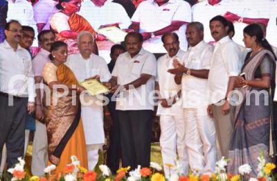 Photo Caption : CM HD Kumarswamy with Minister RV Deshpande, Former CM and Congress leader, Veerappa Moily, MLAs Byrathi Suresh and others distributing position certificates to beneficiaries during the position certificates distribution program at Palace Grounds, in Bengaluru on Thursday 28th February 2019