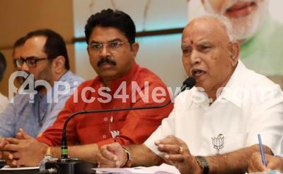 Photo Caption : BJP State President BS Yeddyurappa addressing press conference with BJP State leaders R Ashoka, Raveev Chandrashekar, Govind Karjol at a private hotel, in Bengaluru on Wednesday 13th March 2019