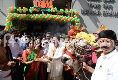 Photo Caption : Union Minister DV Sadananda Gowda and his wife performing Go pooja during inauguration of Bengaluru North Loksaba BJP election office at Yeshwanthpura, also seen are MLA Ashwath Narayan, MLC Narayanswamy and others, in Bengaluru on Friday 15th March 2019