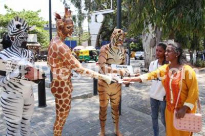 Photo Caption : PETA activists wearing Tiger, Zebra and Giraffe animals masks on the occasion of International Day of Forests and creating awareness on Save The Earth Go Vegan at Brigade Road, in Bengaluru on Tuesday 19th March 2019
