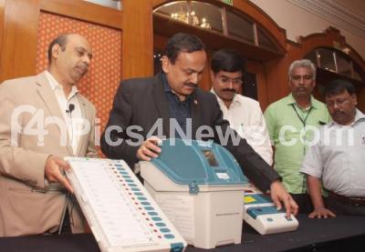 Photo Caption : Chief Electoral Officer of Karnataka, Sanjeev Kumar demonstrating the EVM (Electronic Voting Machines) for the Loka Sabha Elections at a private Hotel, in Bengaluru on Friday 29th March 2019