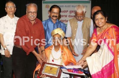 Photo Caption : Poet Dr HS Venkatesh Murthy presenting "Gowri Sundar" award to Poet Subraya Chokkadi during a program organised by Sundara Publications at Indian Institute of World Culture, also seen are Poet BR Lakshman Rao, Dr DV Guruprasad, Writer Ganapathi and others, in Bengaluru on Sunday 31st March 2019