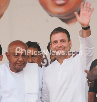 Event Description : Congress president Rahul Gandhi seen with former Prime Minister and JDS Supremo, HD Deve Gowda, CM HD Kumarswamy, Congress leaders Siddaramaiah, KC Venugopal and others at the Lok Sabha Election Rally at BIEC, Tumkur Road, with coalition partners JDS, in Bengaluru on Sunday 31st March 2019