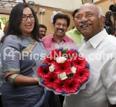 Event Description : JDS State President AH Vishwanth being greeted by Independent Mandya Loka Sabha Candidate Sumalatha Ambareesh during their meet the press program at Press Club, in Bengaluru on Thursday 4th April 2019