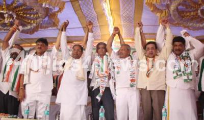 Photo Caption : Congress Bengaluru North Lok Sabha candidate Krishna Byre Gowda with CLP leader Siddaramaiah, Minister Shivakumar, Congress leaders Byrathi Basavaraj, MR Seetharam, JDS MLA Gopalaiah and others during Malleshwaram and Mahalakshmi Layout Assembly constituency party workers meeting at Subramanya Nagar, in Bengaluru on Friday 5th April 2019