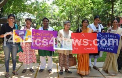 Event Description : Members of Womens March India display placards during their press meet at Press club, in Bengaluru on Monday 8th April 2019