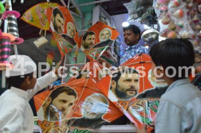 Photo Caption : A shop assistant sells kites bearing images of the Indian political rivals, Prime Minister Narendra Modi and Congress President Rahul Gandhi for the upcoming Lok Sabha elections, in Bengaluru on Friday 12th April 2019