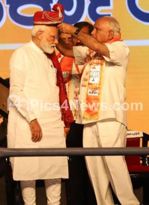 Photo Caption : PM Narendra Modi being felicitated by Karnataka State BJP Leaders SM Krishna, BS Yeddyurappa and others at the BJP Lok Sabha Election Rally at Palace Grounds, in Bengaluru on Saturday 13th April 2019