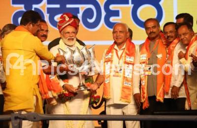 Photo Caption : PM Narendra Modi being felicitated by Karnataka State BJP Leaders SM Krishna, BS Yeddyurappa and others at the BJP Lok Sabha Election Rally at Palace Grounds, in Bengaluru on Saturday 13th April 2019