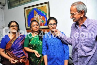 Photo Caption : 2nd PUC Science 2nd rank student Divya K being greeted by her principal Leelavati and others, 2nd PUC results were announced today all over Karnataka, in Bengaluru on Monday 15th April 2019