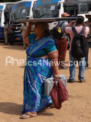 Polling officials collect EVMs and others material at Kamala Bai High School, Queens Road, for the Lok Sabha Elections to be held tomorrow, in Bengaluru on Wednesday 17th April 2019