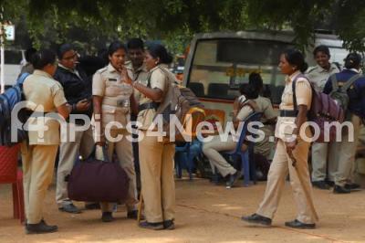 Photo Caption : Police personnel seen leaving to the designated polling station from Kamala Bai High School, Queens Road, for the Lok Sabha Elections to be held tomorrow, in Bengaluru on Wednesday 17th April 2019