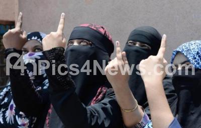 Photo Caption : Muslim women display the indelible ink mark on their finger after casting their vote for the Lok Sabha election at Cock Burn School, Shivajinagar, Bengaluru Central Lok Sabha constituency, in Bengaluru on Thursday 18th April 2019
