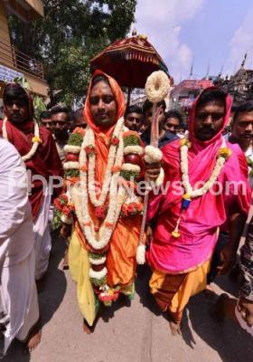 Photo Caption : Karaga bearer seen arriving to attend a Pooja on the occasion of Bangalore Karaga Festival, in Bengaluru on Friday 19th April 2019
