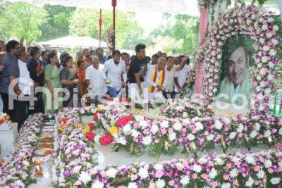 Photo Caption : Shiva Rajkumar, Ragavendra Rajkumar and Rajkumar fans offering floral tribute to Senior Kannada Actor Dr Rajkumar Samadi during his 90th birth anniversary at Kanteerva Studio, in Bengaluru on Wednesday 24th April 2019