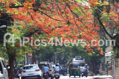 Photo Caption : Poinciana Gulmohar red flowers in full bloom at Malleshwaram, in Bengaluru on Thursday 25th April 2019