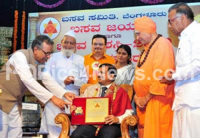 Photo Caption : Mayor Gangambike Mallikarjuna with Arvind Jatti, Chairperson, Basava Samiti, Shivarudra Mahaswamy presented Basava Award 2019 to Dr CN Manjunath on the occasion of Basava Jayanti at Basava Bhavan, in Bengaluru on Tuesday 7th May 2019