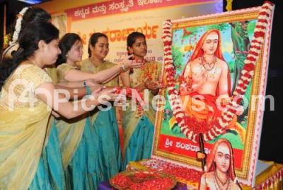 Photo Caption : Women offering floral tribute to Sri Shankaracharya portrait during Sri Shankaracharya Jayanti celebrations organised by Kannada and Culture Dept at Kannada Bhavan, in Bengaluru on Thursday 9th May 2019