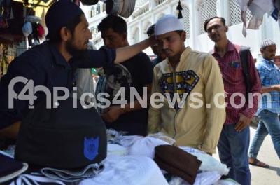 Photo Caption : A muslim man seen buying the skull cap on the 1st Friday prayers of the Holy Month Ramadan at Jamia Mosque at KR Market, in Bengaluru on Friday 10th May 2019