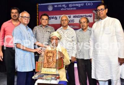 Photo Caption : Shyam Krishnaraya received "Anakru" award from Writer Prof Ashwat Narayana at a award program organised by Ana Kru foundation at Indian Institute of World Culture, in Bengaluru on Sunday 12th May 2019