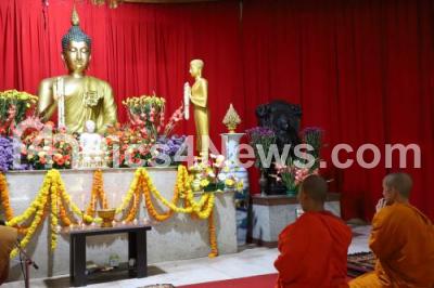 Photo Caption : Buddhist monks performing prayers on the occasion of Bodhi Saptaha Enlightenment Week at Maha Bodhi Society, in Bengaluru on Monday 13th May 2019