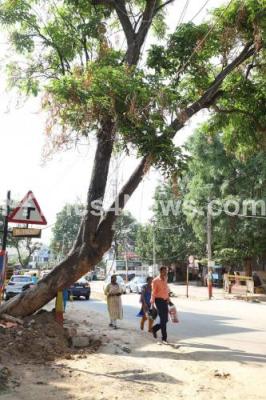 Photo Caption : A tree is found tilting and dangerous, the residents of Millers Tank bund Road, have given the support of a stone for the tree and expect the concerned department to take action before the rainy season starts, in Bengaluru on Tuesday 14th May 2019