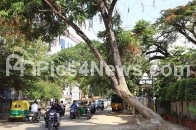 Event Description : A tree is found tilting and dangerous, the residents of Millers Tank bund Road, have given the support of a stone for the tree and expect the concerned department to take action before the rainy season starts, in Bengaluru on Tuesday 14th May 2019