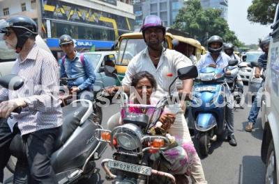 Photo Caption : A man seen riding his bike with his wife sitting in the front space of the bike and the goods are packed behind, in Bengaluru on Saturday 18th May 2019