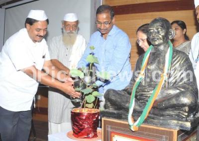 Photo Caption : NR Vishukumar, former Director for Information Department with ooday P Krishna, President, Karnataka Gandhi Samaraka Nidhi, Prasanna, Handloom Activist inaugurated the 150th birth anniversary of Mahatma Gandhi program at Gandhi Bhavan, in Bengaluru on Monday 20th May 2019