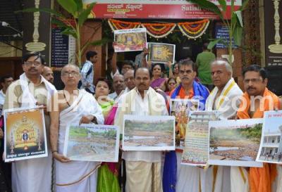 Photo Caption : Members of Akhila Karnataka Bhrahmana Maha Sabha performing special pooja for rains across Karnataka State at Dodda Ganapathi Temple, Basavanagudi, in Bengaluru on Wednesday 22nd May 2019