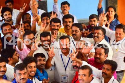 Photo Caption : DV Sadananda Gowda, BJP Lok Sabha candidate Bengaluru North candidate with supporters at the election counting center, during Loka Sabha election results, in Bengaluru on Thursday 23rd May 2019