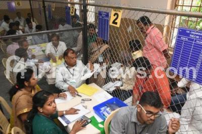 Photo Caption : Election officers seen at the election counting center, during Loka Sabha election results, in Bengaluru on Thursday 23rd May 2019