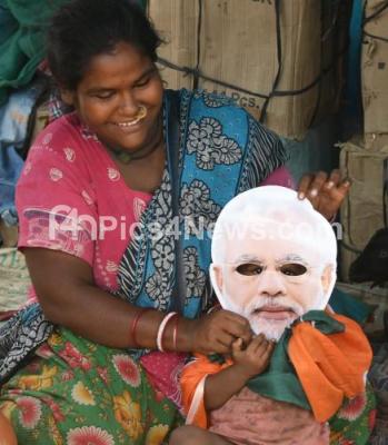 Photo Caption : A mother seen putting the mask of PM Narendra Modi to her child, during the Lok Sabha election results, in Mandya on Thursday 23rd May 2019