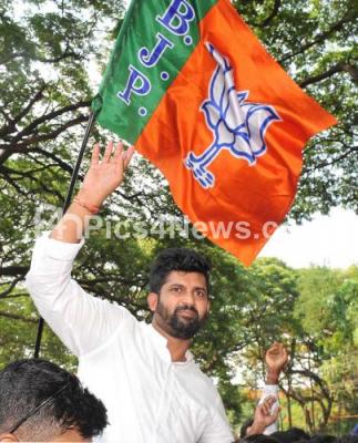 Pratap Simha, BJP Mysuru candidate seen celebrating, during Lok Sabha election results, in Mysuru on Thursday 23rd May 2019