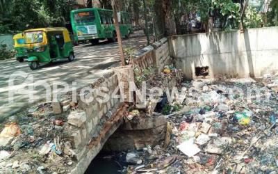 Photo Caption : Drainage bridge wall damaged at Frazer Town due to recent rains and looks very dangerous for motorists and commuters, in Bengaluru on Tuesday 28th May 2019