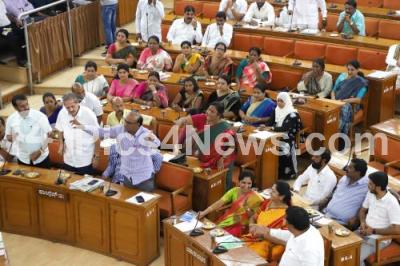 Photo Caption : Congress and BJP Councilors arguing during a BBMP Council meeting at BBMP office, in Bengaluru on Thursday 30th May 2019