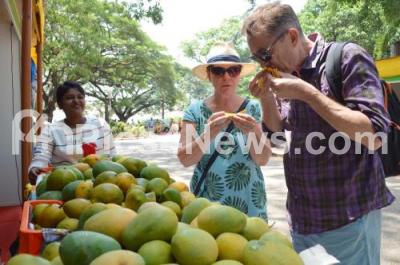 Photo Caption : Foreign tourists tasting mangos during Mango and Jack fruit mela organised by Horticulture Department at Lalbagh, in Bengaluru on Thursday 30th May 2019