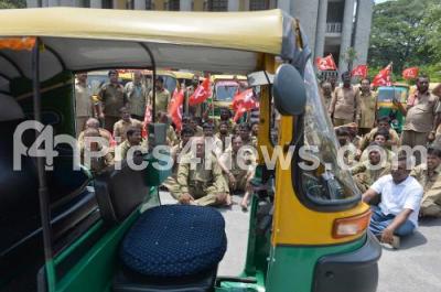 Photo Caption : Members of Auto rickshaw driver union staging a protest in front of Town Hall to press their various demands, in Bengaluru on Thursday 30th May 2019