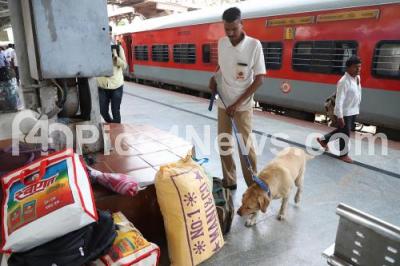 Photo Caption : Sniffer dogs in action after chaos broke out at Bangalore city railway station after grenade casings were found near Patna bound Sanghamitra Express train, a bomb disposal squad along with railway police rushed to the spot to investigate the matter, in Bengaluru on Friday 31st May 2019
