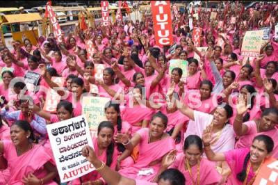 Photo Caption : Asha Workers staging a protest at Gandhi Statue, Anand Rao Circle, demanding for immediate release of their pending salaries, in Bengaluru on Wednesday 12th June 2019
