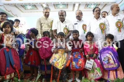 Photo Caption : CM HD Kumarswamy, DCM Dr G Parameshwar, MLA Roshan Baig, Minister Sa ra Mahesh and others distributing school bags to the students during the inauguration of Karnataka Public School at banquet Hall, Vidhan Soudha, organised by Karnataka Public Education Department, in Bengaluru on Friday 14th June 2019