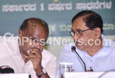 Photo Caption : Chief Minister HD Kumaraswamy and Deputy Chief Minister Dr G Parameshwar seen during the one year achievement of the coalition government program at Vidhana Soudha, in Bengaluru on Thursday 20th June 2019