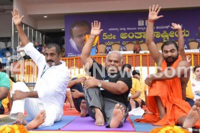 Photo Caption : Yoga Guru Vachananda Swamiji with Ministers Rahim Khan, Shivananda Patil and yoga enthusiasts performing yoga in mass yoga event to mark International Yoga Day at Kanteerva Stadium, in Bengaluru on Friday 21st June 2019