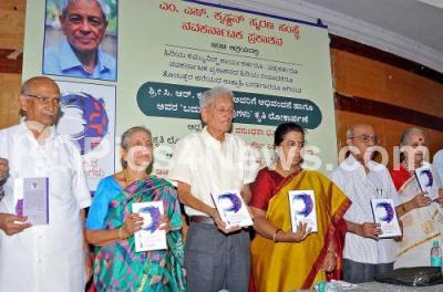 Photo Caption : CR Krishna Rao with Dr Vasundara Bhupathi, Nadoja Prof HM Krishnaiah, Dr G Ramakrihsna, Dr Vijaya and others at the release of "Badukina Tiruvugalu" Kannada book on CRK at Gandhi Bhavan, in Bengaluru on Sunday 23rd June 2019