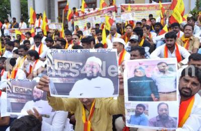Event Description : Members of Karnataka Rakshana Sene protesting against IMA founder Mansoor Khan, for the multi crore IMA Scam, the protest was held at Town Hall, in Bengaluru on Sunday 23rd June 2019