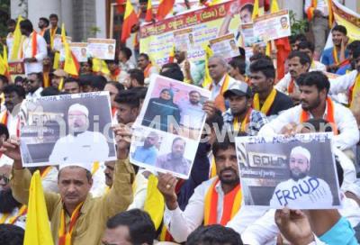 Photo Caption : Members of Karnataka Rakshana Sene protesting against IMA founder Mansoor Khan, for the multi crore IMA Scam, the protest was held at Town Hall, in Bengaluru on Sunday 23rd June 2019