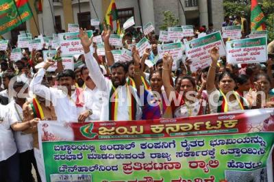 Photo Caption : Members of Jaya Karnataka staged a protest against the state government in the Jindal Land deal issue at Town Hall, in Bengaluru on Monday 24th June 2019