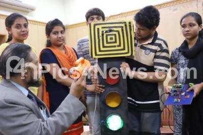 Photo Caption : Students of Sapthagiri College of Engineering demonstrated the innovation of Traffic light control system for ambulance during a press conference at Press Club, which system innovated for swift passage Ambulance through traffic lights junctions, in Bengaluru on Wednesday 26th June 2019